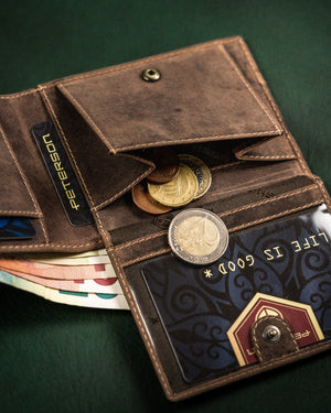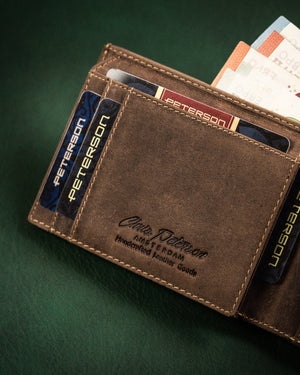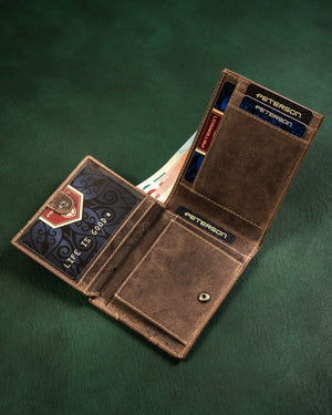 Ši elegantiška moteriška piniginė iš Peterson kolekcijos yra pagaminta iš aukštos kokybės natūralios odos, kuri užtikrina ilgaamžiškumą ir stilingą išvaizdą. Rudos spalvos dizainas suteikia klasikinį ir universalų įvaizdį, puikiai derantį prie įvairių stilių.
