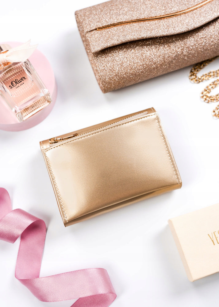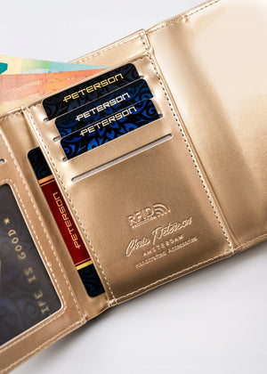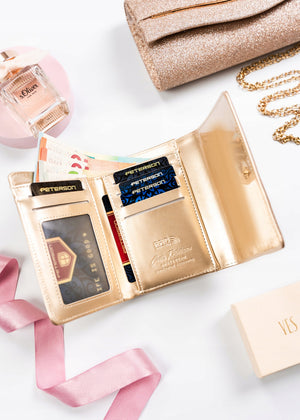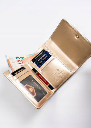 Ši piniginė ne tik talpina visas jūsų korteles, bet ir užtikrina jų saugumą su integruota RFID apsauga. Jos vidutinis dydis leidžia patogiai nešiotis tiek rankinėje, tiek kišenėje. Auksinė spalva suteikia elegancijos ir išskirtinumo, todėl ši piniginė taps puikiu jūsų kasdienio stiliaus akcentu.