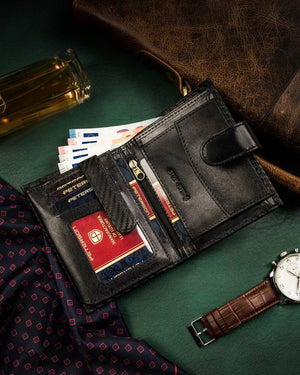 Ši elegantiška piniginė, pagaminta iš aukštos kokybės natūralios odos, yra puikus pasirinkimas vyrams, vertinantiems stilių ir funkcionalumą. Juodos spalvos dizainas suteikia klasikinį ir universalų įvaizdį, tinkantį bet kokiai progai.