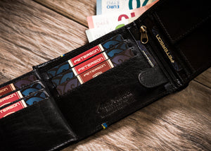 Ši elegantiška ir funkcionali piniginė yra puikus pasirinkimas vyrams, vertinantiems kokybę ir saugumą. Pagaminta iš natūralios odos, ji užtikrina ilgaamžiškumą ir stilingą išvaizdą. Juoda spalva suteikia universalumo, todėl piniginė puikiai tiks prie bet kokio stiliaus. Dėl integruotos RFID apsaugos jūsų kortelės bus apsaugotos nuo nepageidaujamo nuskaitymo. Piniginėje yra 6-10 kortelių skyrių, todėl ji yra praktiška ir talpi. Kompaktiški išmatavimai leidžia patogiai nešiotis piniginę kišenėje ar krepšyje.