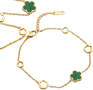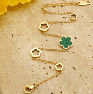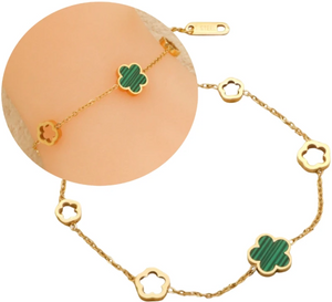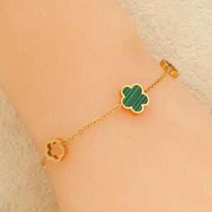 Ši apyrankė ne tik suteikia prabangos, bet ir yra saugi jautriai odai dėl antialerginių savybių. Žalia gėlė, esanti apyrankės centre, suteikia žavesio ir gaivumo, todėl ji puikiai dera tiek su elegantiškais, tiek su kasdieniais drabužiais. Auksinė spalva harmoningai susilieja su žaliu akcentu, sukurdama madingą ir darnią visumą.