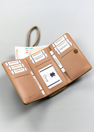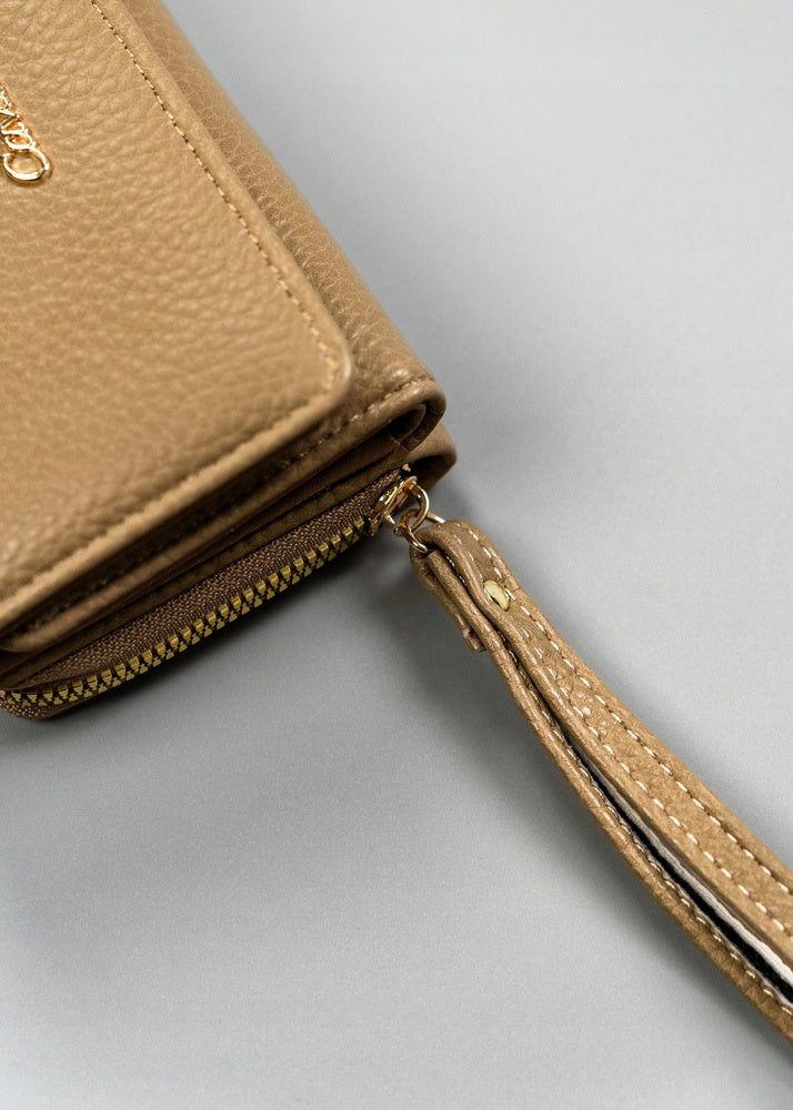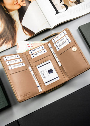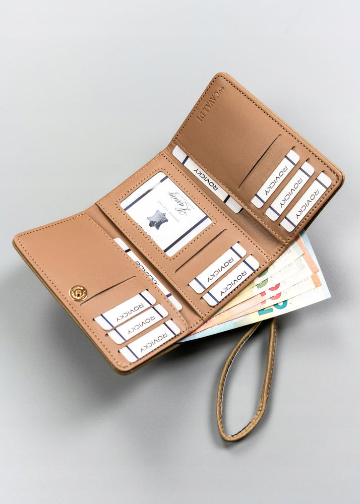 Ši elegantiška moteriška piniginė yra puikus pasirinkimas tiems, kurie vertina stilių ir funkcionalumą. Jos vidutinis dydis leidžia patogiai laikyti visus būtiniausius daiktus, o tamsiai smėlinė spalva suteikia subtilaus žavesio.