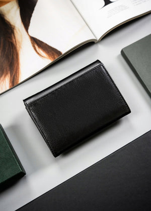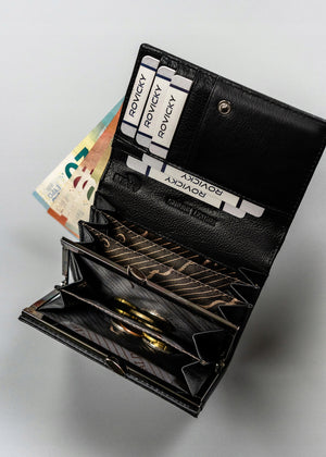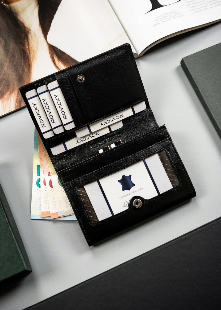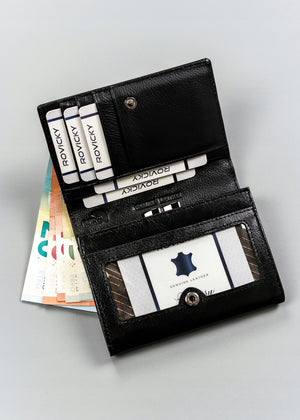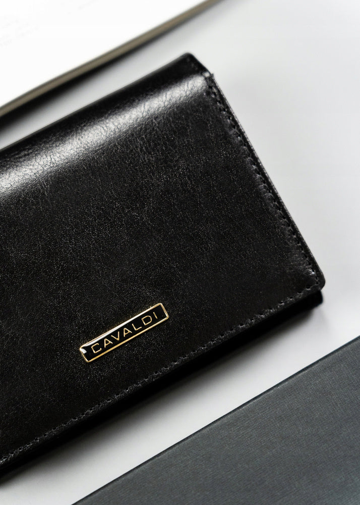 Ši elegantiška moteriška piniginė iš 4U Cavaldi yra pagaminta iš aukštos kokybės natūralios odos, užtikrinančios ilgaamžiškumą ir stilių. Juoda spalva suteikia universalumo, todėl ji puikiai tiks prie bet kokios aprangos. Vidutinio dydžio piniginė yra patogi ir praktiška, turinti RFID apsaugą, kuri padės apsaugoti jūsų korteles nuo neteisėto nuskaitymo. Piniginėje yra 1-5 kortelių skyriai ir atskiras skyrelis monetoms, todėl viskas bus tvarkingai sudėta. Jos kompaktiški išmatavimai leidžia lengvai tilpti į rankinę ar kišenę.