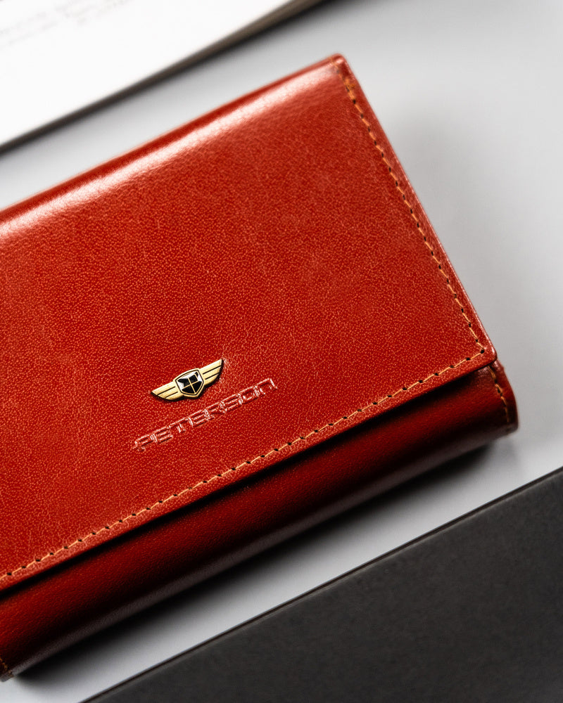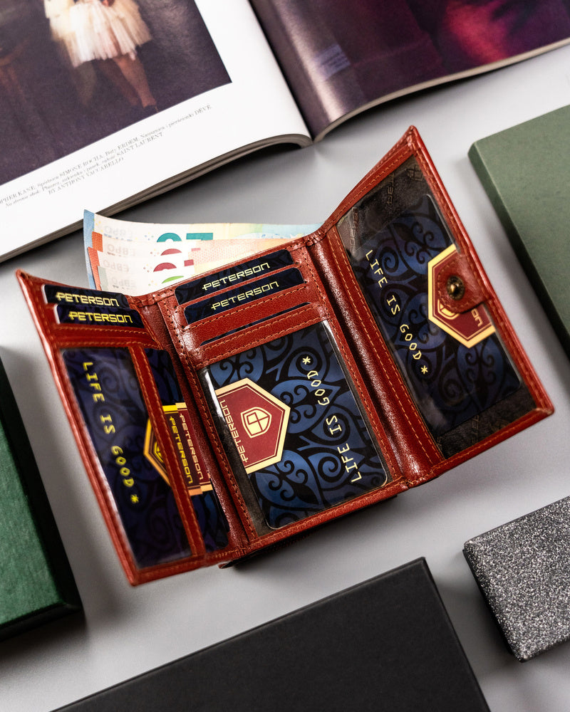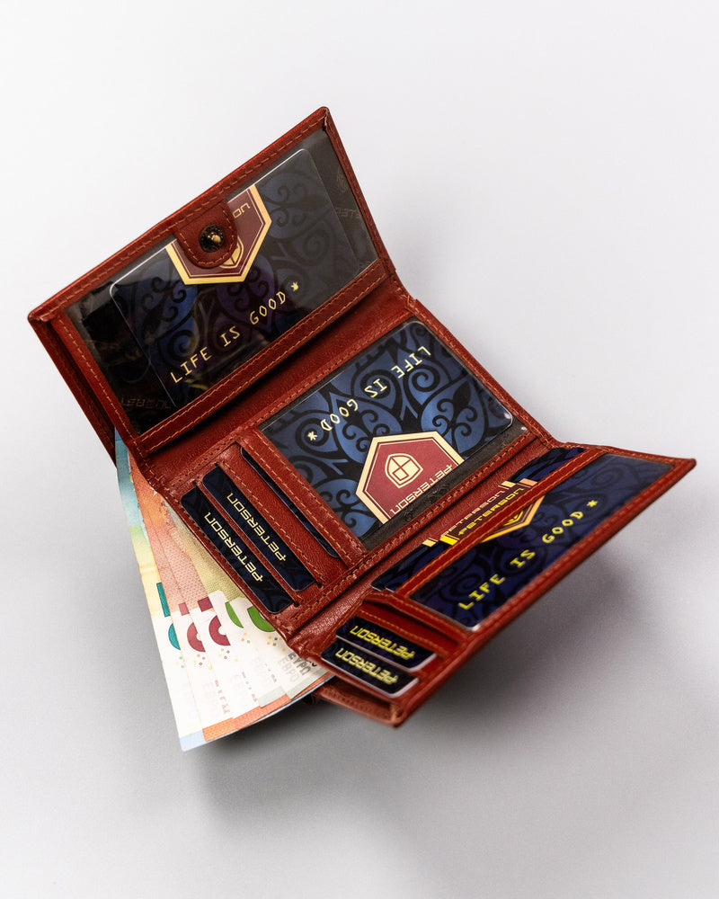 Ši elegantiška moteriška piniginė iš Peterson kolekcijos yra pagaminta iš aukštos kokybės natūralios odos. Jos šviesiai ruda spalva suteikia subtilumo ir stiliaus. Vidutinio dydžio piniginė yra praktiška ir patogi kasdieniam naudojimui. Ji turi 6-10 kortelių skyrius, kurie padės tvarkingai laikyti visas jūsų korteles. Be to, piniginėje yra atskiras skyrius monetoms, užtikrinantis patogų ir saugų jų laikymą. Su matmenimis 9 cm x 12,5 cm x 3,5 cm, ši piniginė puikiai tiks tiek rankinėje, tiek kišenėje.
