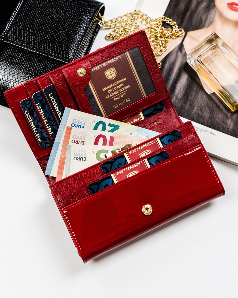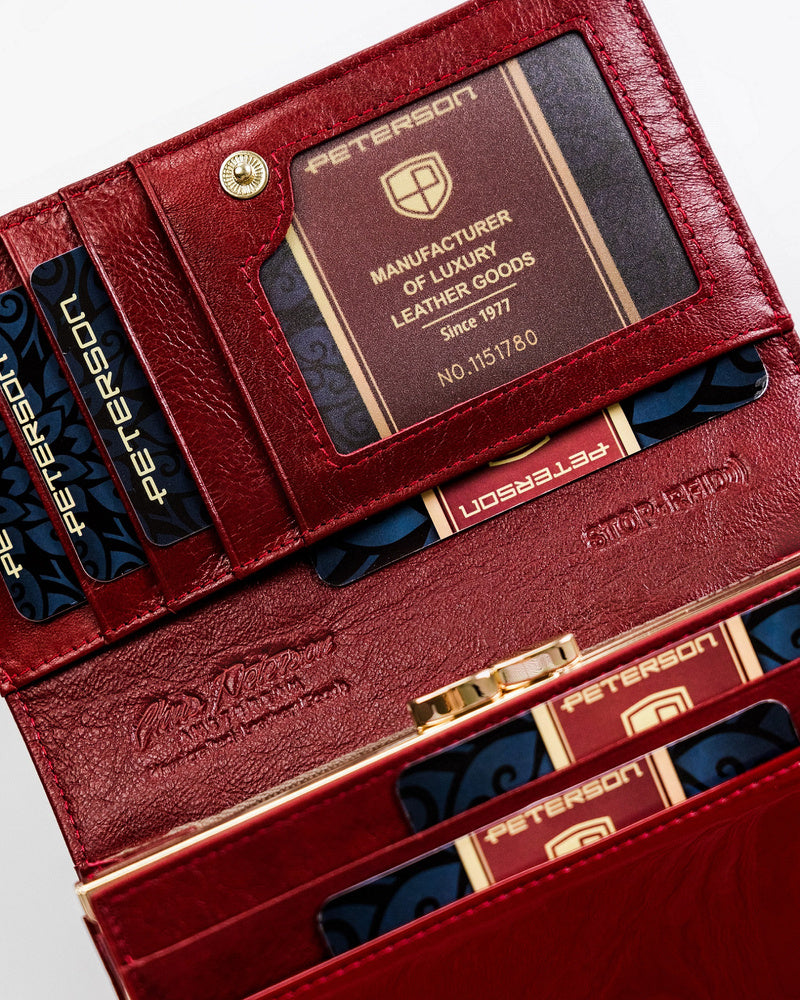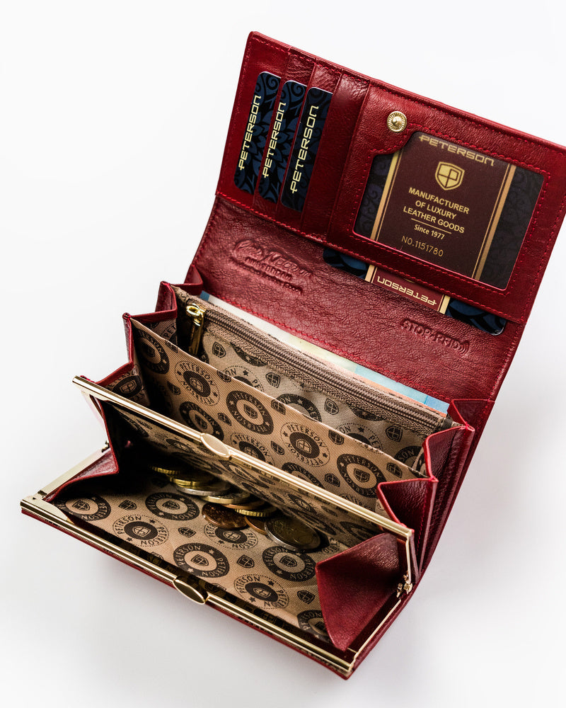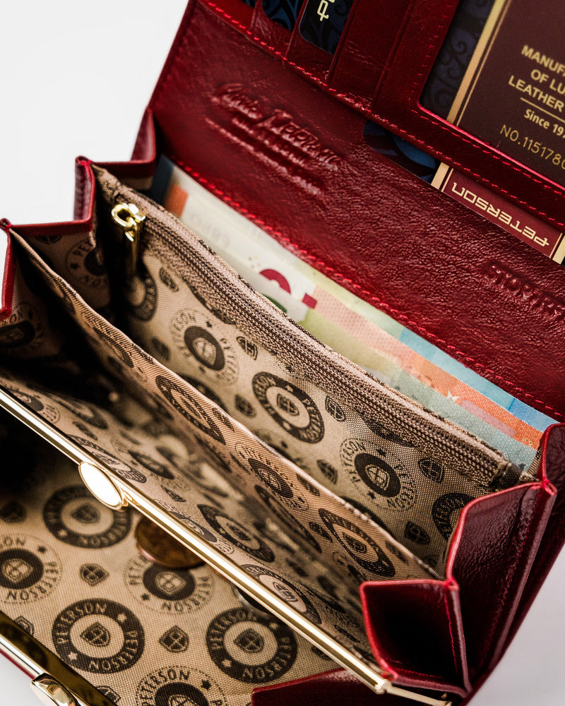 Ši elegantiška moteriška piniginė iš Peterson kolekcijos yra pagaminta iš aukštos kokybės natūralios odos. Raudona spalva suteikia išskirtinumo ir stiliaus, o vidutinis dydis užtikrina patogumą kasdieniam naudojimui. Piniginėje yra 1-5 kortelių skyriai ir atskiras skyrius monetoms, todėl ji yra praktiška ir funkcionali.
