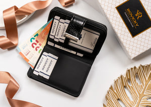 Ši elegantiška ir funkcionali piniginė moterims Rovicky L102 yra puikus pasirinkimas ieškantiems kokybės ir stiliaus. Pagaminta iš natūralios odos, ji užtikrina ilgaamžiškumą ir patikimumą. Juoda spalva suteikia universalumo, todėl piniginė puikiai derės prie bet kokios aprangos. Vidutinio dydžio piniginė yra patogi nešioti kasdien, o RFID apsauga padės apsaugoti jūsų korteles nuo nepageidaujamo nuskaitymo. Su 6-10 kortelių skyriais, ši piniginė suteikia pakankamai vietos visiems jūsų svarbiausiems daiktams.