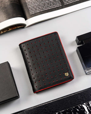 Ši elegantiška ir funkcionali piniginė vyrams yra pagaminta iš aukštos kokybės natūralios odos, kuri užtikrina ilgaamžiškumą ir stilingą išvaizdą. Pagrindinė piniginės spalva yra klasikinė juoda, o detalių akcentai – aukso spalvos, suteikiantys prabangos pojūtį.