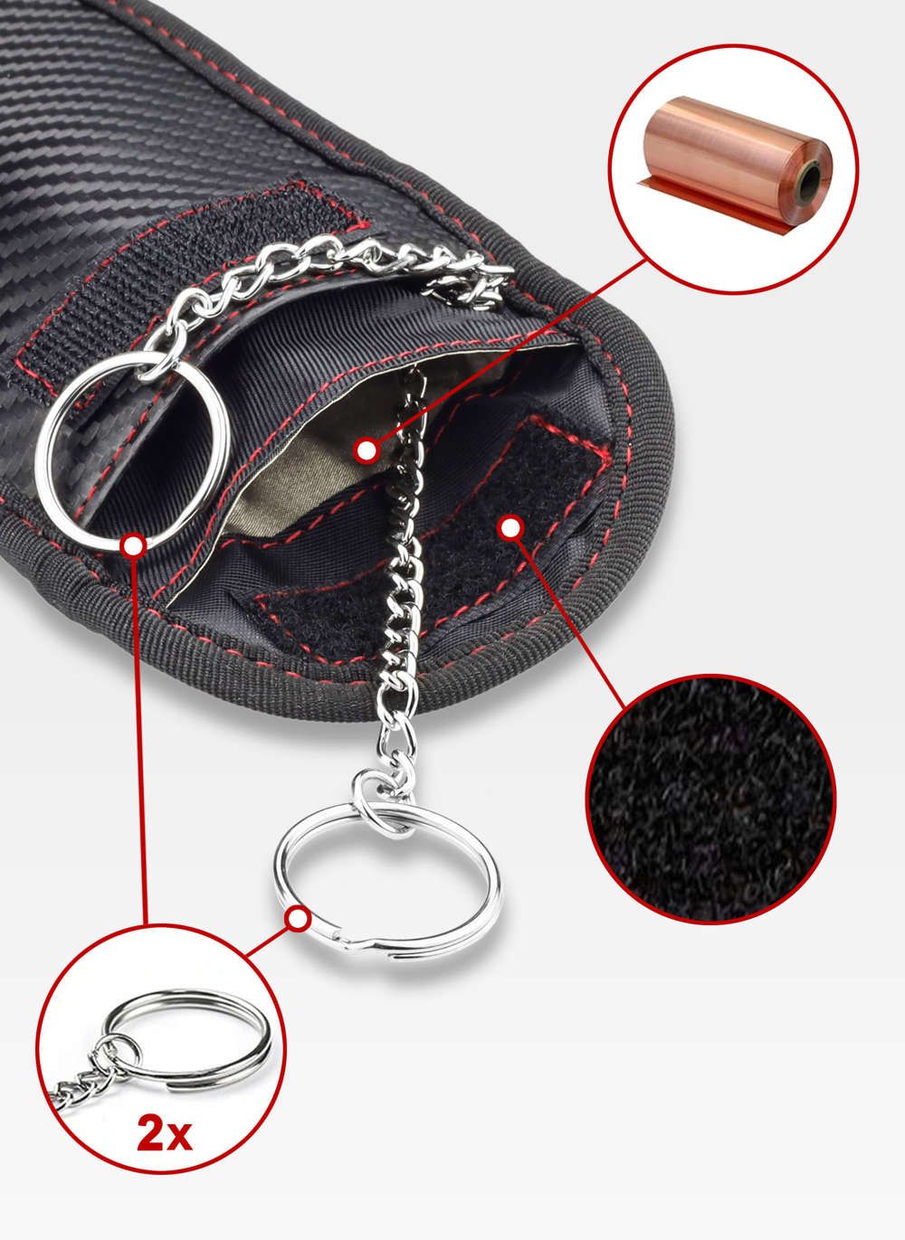 - Du raktų pakabukai: Dvi atskiros grandinėlės su žiedais, prie kurių galite pritvirtinti automobilio ir kitus raktus.