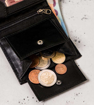 - 2 atviri skyriai banknotams, susiūti per visą piniginės plotį.
