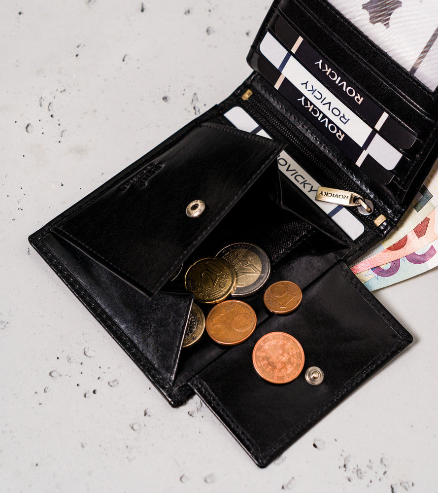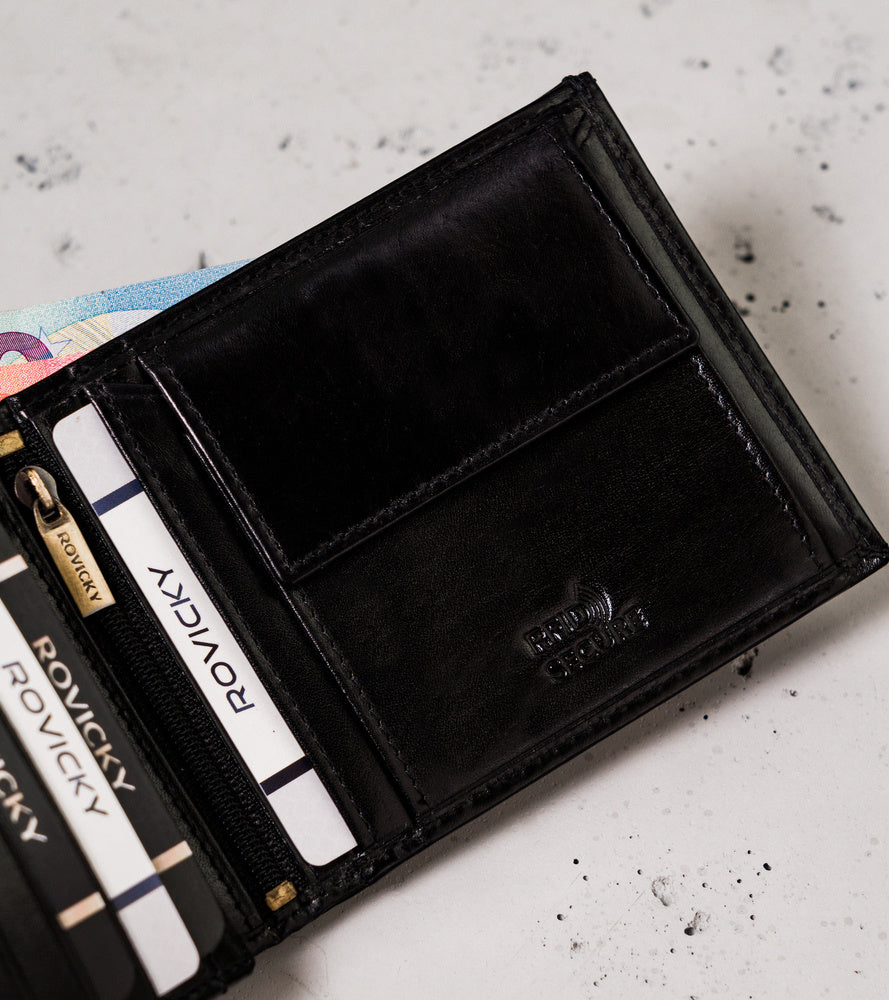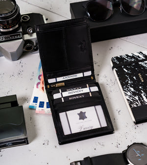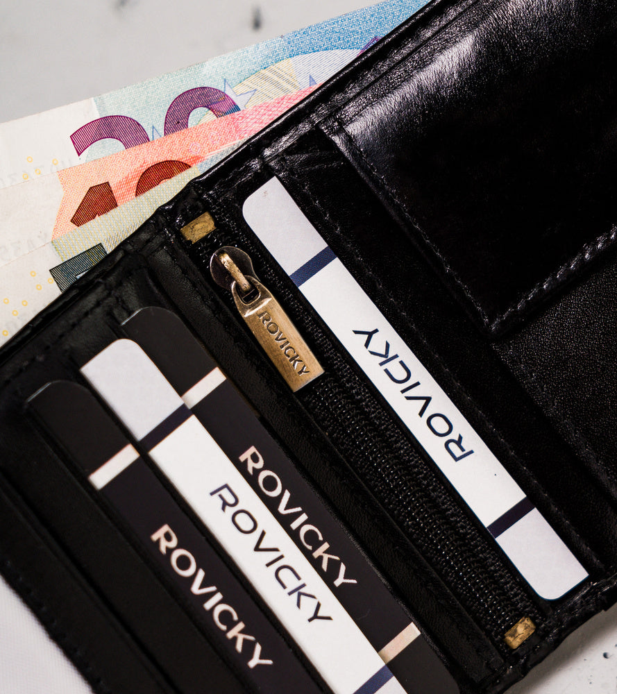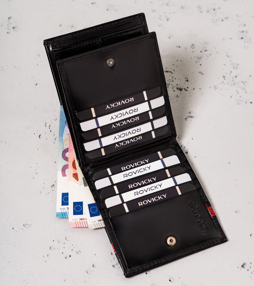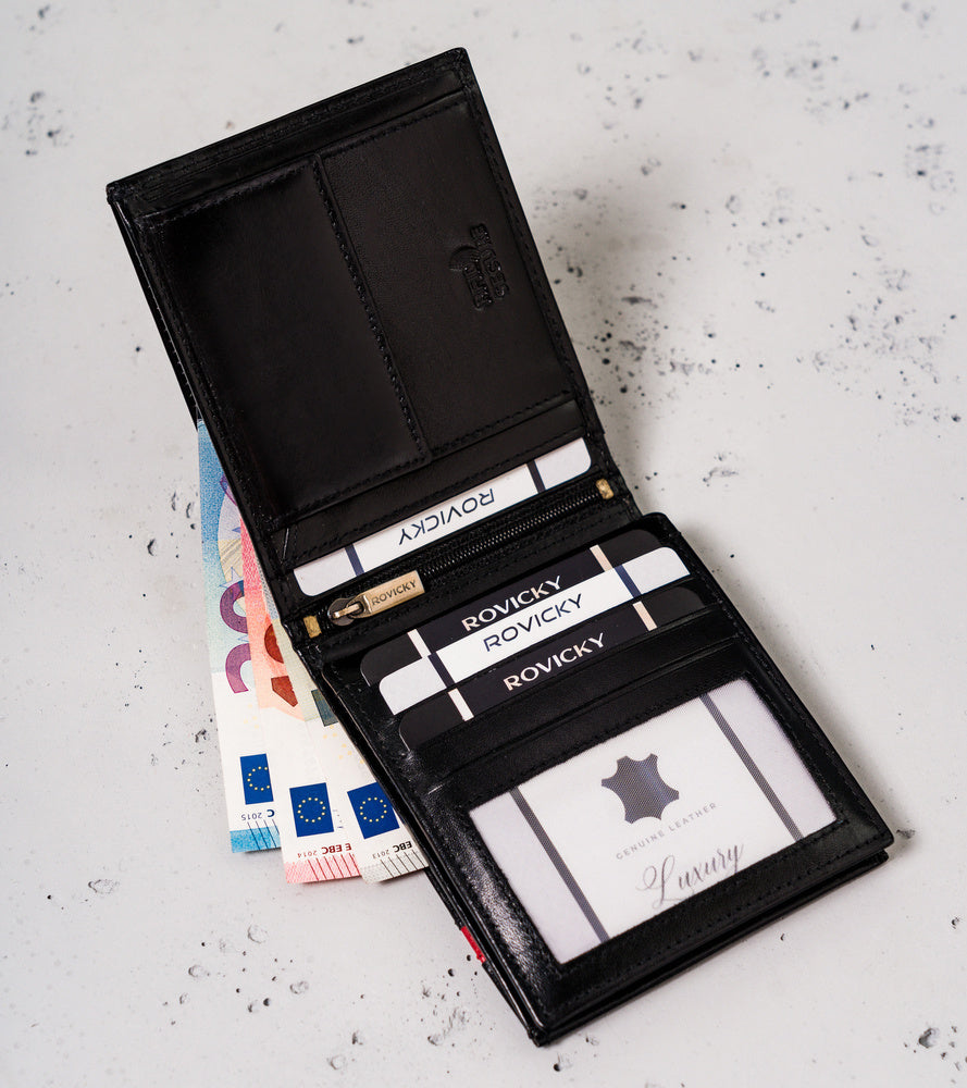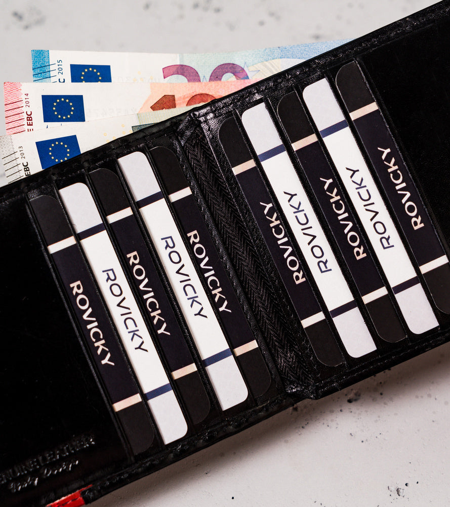 Ši elegantiška vyriška piniginė iš Rovicky yra pagaminta iš aukštos kokybės natūralios odos, kuri užtikrina ilgaamžiškumą ir stilingą išvaizdą. Juodos spalvos dizainas suteikia klasikinį ir universalų įvaizdį, tinkantį bet kokiai progai.