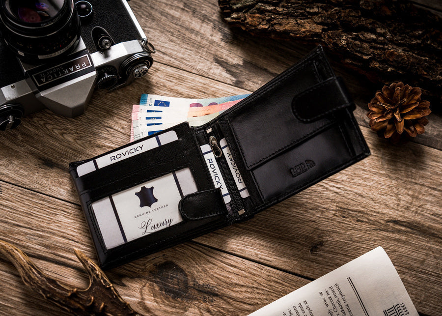 Ši elegantiška vyriška piniginė iš Rovicky yra pagaminta iš aukštos kokybės natūralios odos, užtikrinančios ilgaamžiškumą ir stilingą išvaizdą.