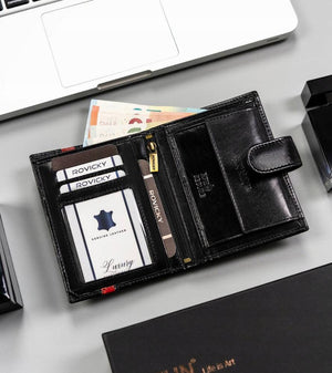 Ši elegantiška vyriška piniginė iš Rovicky yra pagaminta iš aukštos kokybės natūralios odos, užtikrinančios ilgaamžiškumą ir stilingą išvaizdą. Juodos spalvos dizainas suteikia klasikinį ir universalų įvaizdį, tinkantį bet kokiai progai.