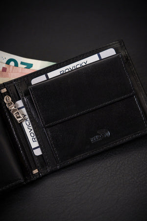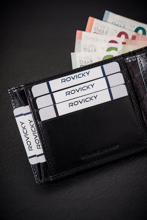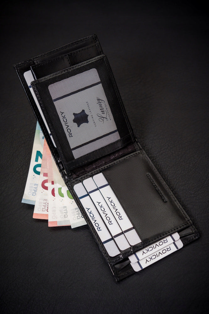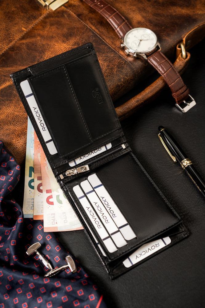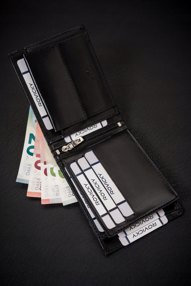 Ši elegantiška vyriška piniginė iš Rovicky yra pagaminta iš aukštos kokybės natūralios odos, kuri užtikrina ilgaamžiškumą ir stilingą išvaizdą. Juoda spalva suteikia klasikinį ir universalų įvaizdį, tinkantį bet kokiai progai.
