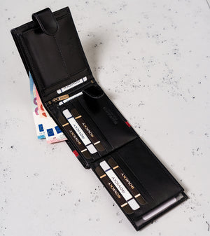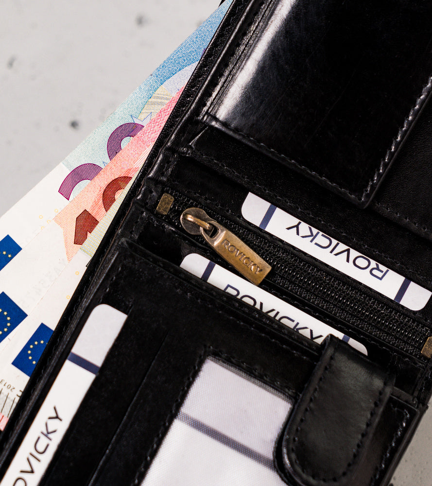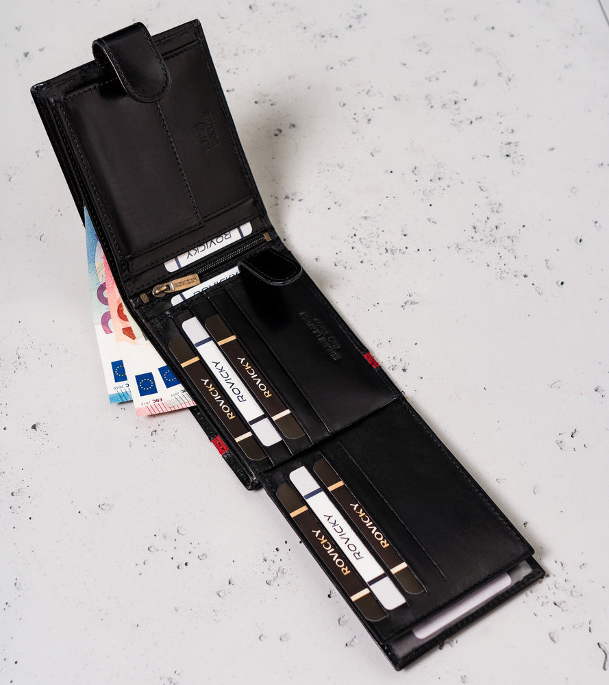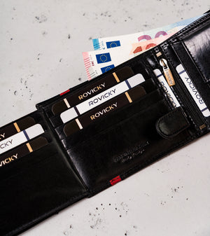 Ši vyriška odinė piniginė Rovicky RV90 yra elegantiškas ir funkcionalus pasirinkimas. Pagaminta iš aukštos kokybės natūralios odos, ji užtikrina ilgaamžiškumą ir stilių. Galima rinktis iš dviejų spalvų – juodos ir raudonos. Vidutinio dydžio piniginė turi 6-10 kortelių skyrius, todėl lengvai sutalpinsite visas reikalingas korteles. Be to, piniginė yra su RFID apsauga, kuri padeda apsaugoti jūsų kortelių duomenis nuo neteisėto nuskaitymo. Jos kompaktiški išmatavimai leidžia patogiai nešiotis kasdien.