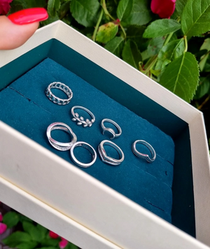Šis žiedų rinkinys, sudarytas iš septynių unikalių elementų, yra pagamintas iš aukštos kokybės juvelyrinio metalo. Kiekvienas žiedas gali būti dėvimas atskirai arba kartu, suteikiant galimybę kurti įvairius stilius.
