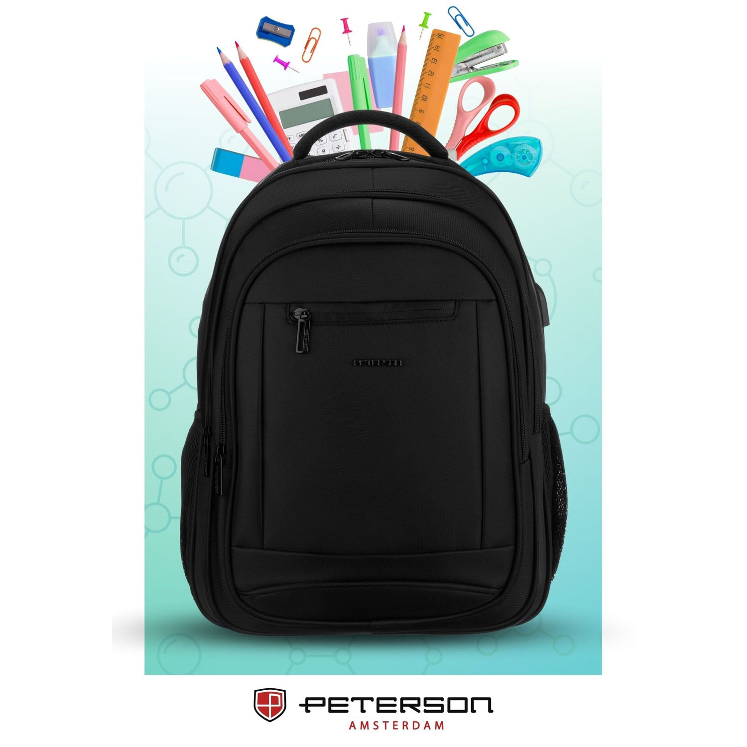 Peterson juoda didelė kuprinė su dviem skyriais, pagaminta iš poliesterio, puikiai tinka kasdieniam naudojimui.