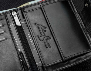 - Kortelių ir dokumentų sekcija: 11 vietų kortelėms, 2 skyriai registracijos liudijimui, 2 kišenės dokumentams, užsegama kišenė didesniems plokštiems daiktams, kišenė nuotraukai