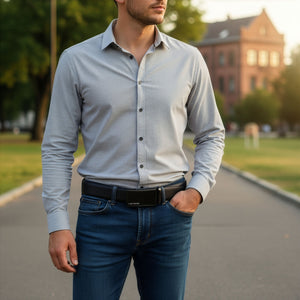 Automatinė sagtis pagaminta iš metalo lydinio ir padengta matiniu juodu paviršiumi. Minimalistinis, švarus dizainas be perteklinių detalių suteikia diržui modernų, solidų charakterį ir puikiai dera tiek prie klasikinio, tiek prie kasdienio stiliaus.