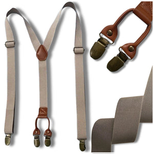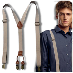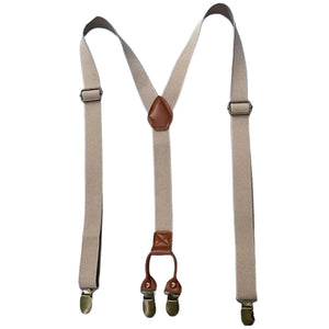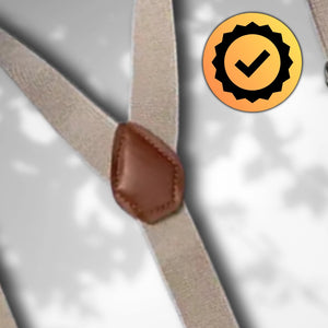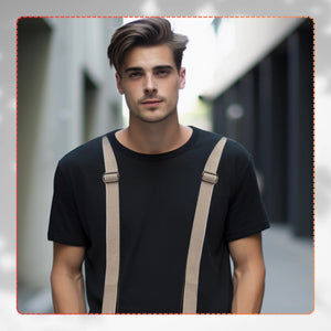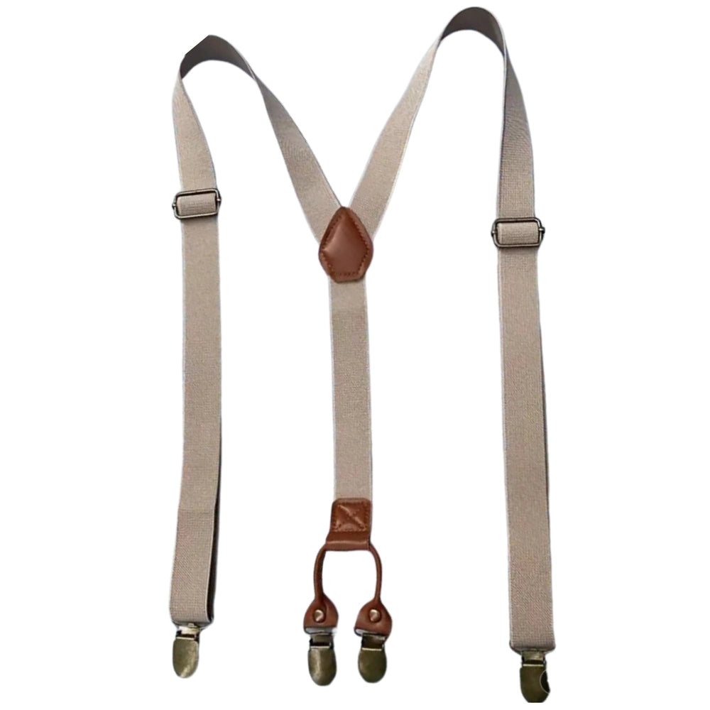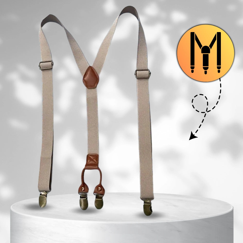 Elegantiškos vyriškos smėlio spalvos petnešos su reguliuojamu ilgiu ir plieninėmis sagtimis.